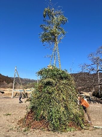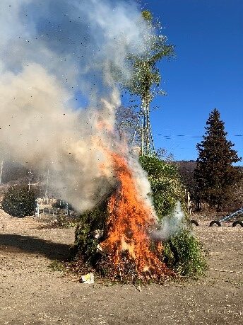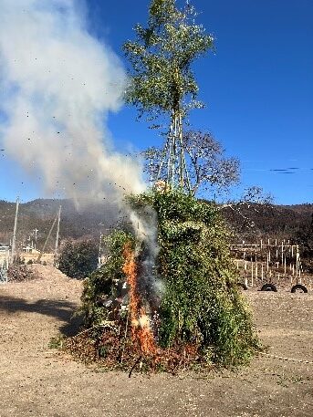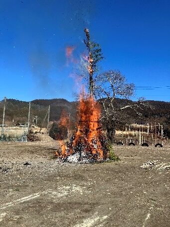 1月10日に、旧坂本小学校の校庭で、坂本地区のどんど焼きが行われました。どんど焼きとは、正月の終わりに神様を見送り、新しい1年の平安を願う美しい火の儀礼で、門松やしめ縄を炎に託し、燃え上がる光の中で未来への祈りを捧げる行事で、そこには、日本人が育んできた自然と神への感謝の心が息づいています。