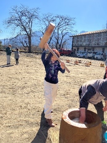 坂本地区の皆さん50人ほどが集まり、お餅つきや甘酒などをふるまっていただき楽しいひと時を過ごさせていただきました。「もっと腰をしっかりさせて!」など、声援?をうけながら、私も頑張ってお餅をつきました。