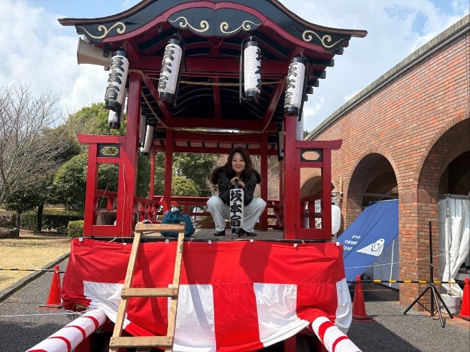 展示されていた坂本の山車に乗って記念撮影↑